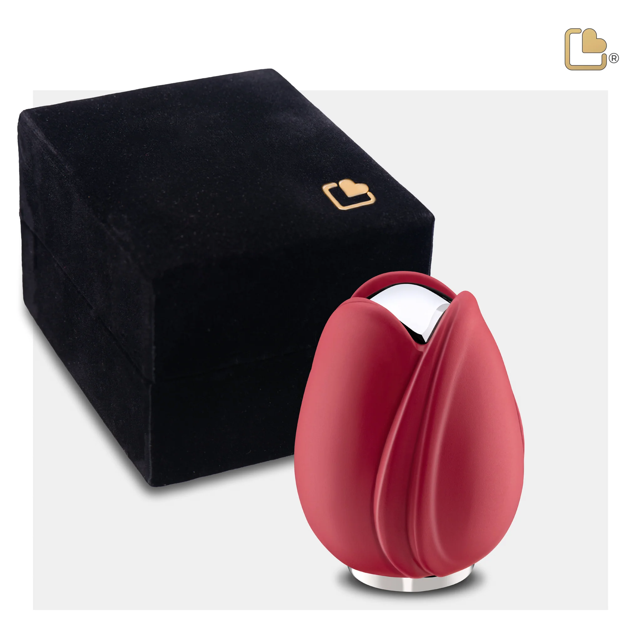 De Tulip™ collectie van LoveUrns is geïnspireerd op de vroege lentebloesems die hoop en wedergeboorte symboliseren. Onze tulp mini-urn in rood en gepolijst zilver belichaamt op prachtige wijze dezelfde essentie als deze levendige bloemen.Dit prachtige eerbetoon aan uw dierbare is een bewijs van de voortdurende schoonheid van het leven en de herinneringen aan degenen die u het meest dierbaar zijn.Ontworpen om comfort te bieden door zijn unieke en artistieke ontwerp, biedt deze kleine urn een boeiend kunstwerk dat op subtiele wijze de as omhult in zijn sierlijke vorm. Het is mogelijk niet meteen duidelijk dat de tulp een urn is, waardoor het overal in uw huis tentoongesteld kan worden.Door zijn bescheiden formaat biedt deze mini-urn de mogelijkheid voor een kleine hoeveelheid as (0,1 liter). Gemaakt van hoogwaardig messing, is de urn duurzaam en verfijnd. De SoftCoat™️-afwerking beschermt niet alleen het ontwerp, maar voegt ook een subtiele textuur toe die bijdraagt aan de algehele uitstraling.