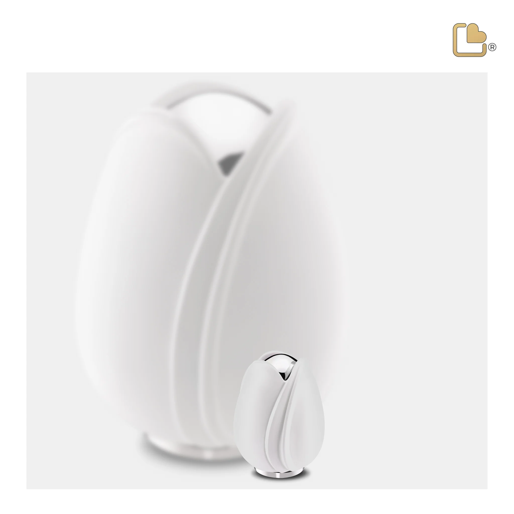 De Tulip™ collectie van LoveUrns is geïnspireerd op de vroege lentebloesems die hoop en wedergeboorte symboliseren. Onze tulp mini-urn in wit en gepolijst zilver belichaamt op prachtige wijze dezelfde essentie als deze levendige bloemen.Dit prachtige eerbetoon aan uw dierbare is een bewijs van de voortdurende schoonheid van het leven en de herinneringen aan degenen die u het meest dierbaar zijn.Ontworpen om comfort te bieden door zijn unieke en artistieke ontwerp, biedt deze kleine urn een boeiend kunstwerk dat op subtiele wijze de as omhult in zijn sierlijke vorm. Het is mogelijk niet meteen duidelijk dat de tulp een urn is, waardoor het overal in uw huis tentoongesteld kan worden.Door zijn bescheiden formaat biedt deze mini-urn de mogelijkheid voor een kleine hoeveelheid as (0,1 liter). Gemaakt van hoogwaardig messing, is de urn duurzaam en verfijnd. De SoftCoat™️-afwerking beschermt niet alleen het ontwerp, maar voegt ook een subtiele textuur toe die bijdraagt aan de algehele uitstraling.