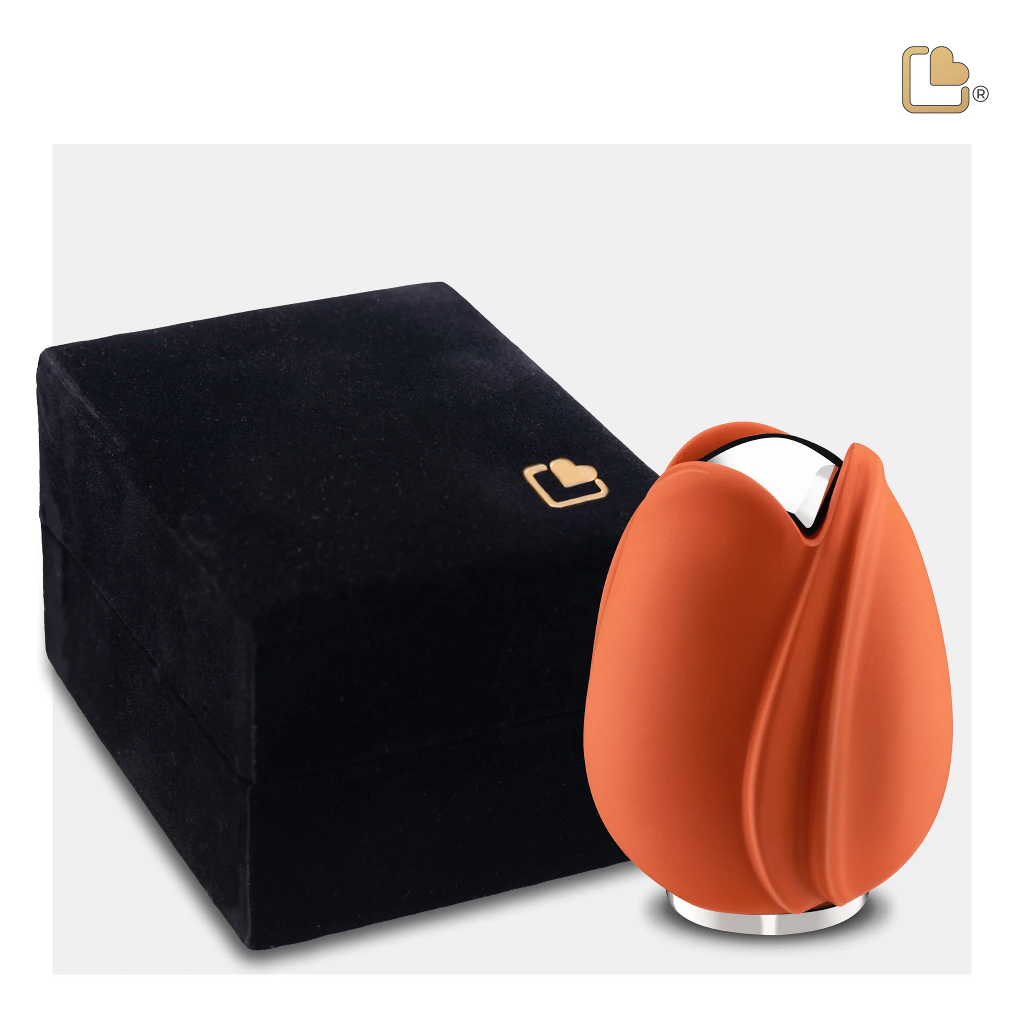 De Tulip™ collectie van LoveUrns is geïnspireerd op de vroege lentebloesems die hoop en wedergeboorte symboliseren. Onze tulp mini-urn in oranje en gepolijst zilver belichaamt op prachtige wijze dezelfde essentie als deze levendige bloemen.Dit prachtige eerbetoon aan uw dierbare is een bewijs van de voortdurende schoonheid van het leven en de herinneringen aan degenen die u het meest dierbaar zijn.Ontworpen om comfort te bieden door zijn unieke en artistieke ontwerp, biedt deze kleine urn een boeiend kunstwerk dat op subtiele wijze de as omhult in zijn sierlijke vorm. Het is mogelijk niet meteen duidelijk dat de tulp een urn is, waardoor het overal in uw huis tentoongesteld kan worden.Door zijn bescheiden formaat biedt deze mini-urn de mogelijkheid voor een kleine hoeveelheid as (0,1 liter). Gemaakt van hoogwaardig messing, is de urn duurzaam en verfijnd. De SoftCoat™️-afwerking beschermt niet alleen het ontwerp, maar voegt ook een subtiele textuur toe die bijdraagt aan de algehele uitstraling.