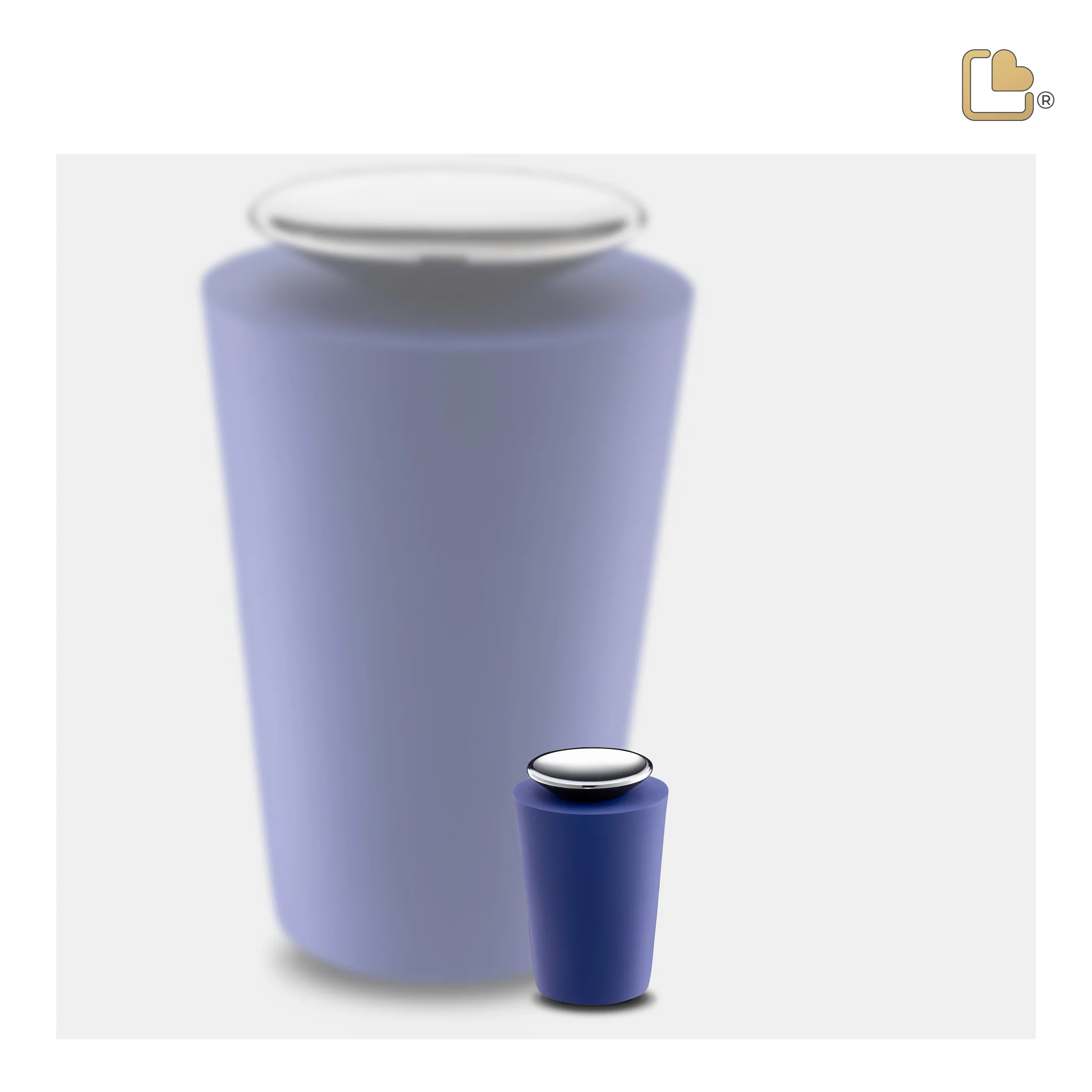 Eer uw geliefde met een onderscheidend kunstwerk dat klasse en verfijning uitstraalt. De Crescent™ hoge mini-urn is een modern meesterwerk, ontworpen om prominent tentoongesteld te worden op een prominente plek.Deze unieke urn, met zijn omgekeerde kegelvorm, trekt het oog met zijn indigo marineblauwe tint. Het majestueuze conische beeldhouwwerk is bedekt met prachtig gepolijst geborsteld zilver, dat de blauwe kleur van de urn accentueert en de symmetrische vormen benadrukt.De eigentijdse urn straalt elegantie en prestige uit, en vormt een passend eerbetoon aan de persoon die u liefhad en bewonderde. Het avant-gardistische ontwerp viert hun leven en biedt een liefdevol bewijs van hun betekenis in uw leven en emoties.