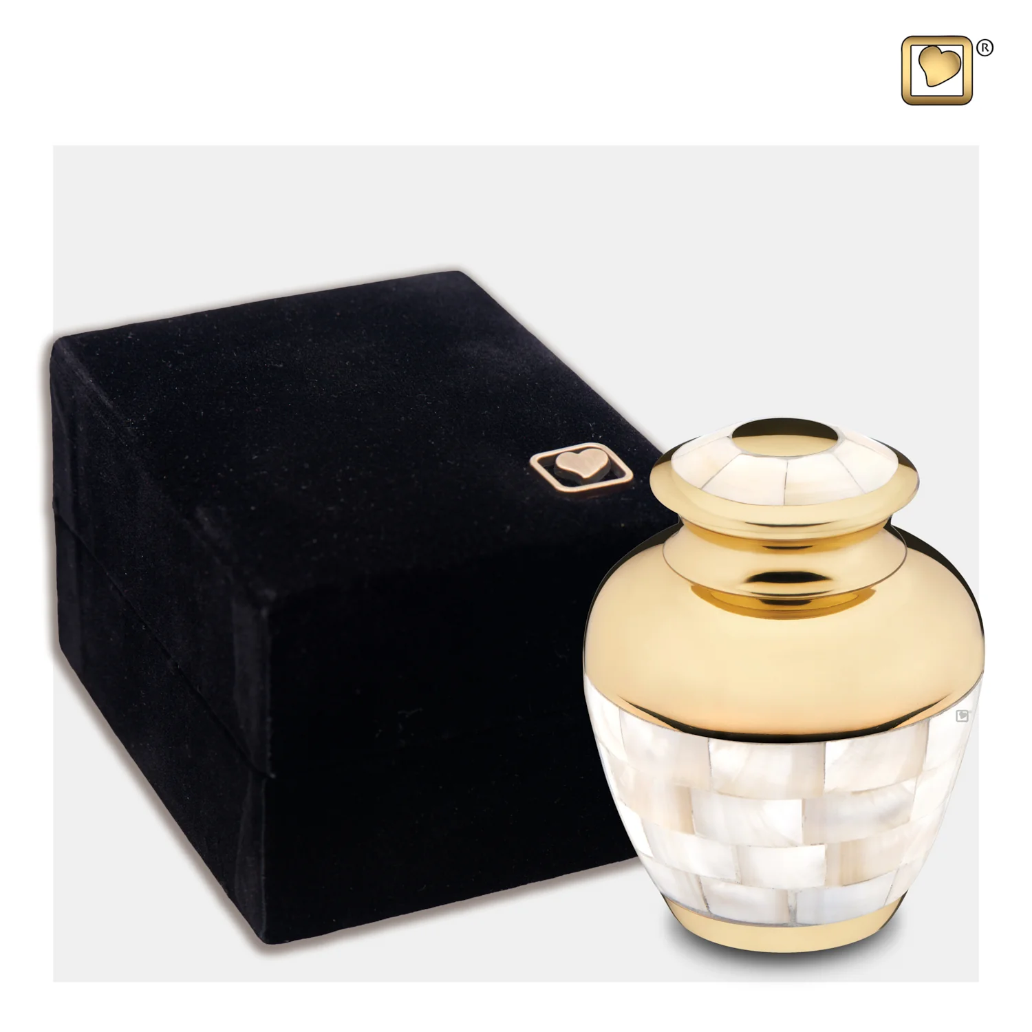 De Mother of Pearl™ parelmoer mini-urn is prachtig ontworpen, met een complexe en ambachtelijke vervaardiging. Dit stuk is ideaal voor diegenen die een voorliefde hebben voor extravagantie of verfijning, of voor iemand die hield van een klassieke inrichting en stijl.De kleinere urn biedt ruimte voor een deel van de as van een geliefde en is gemaakt van messing met een gouden afwerking aan de buitenkant. Op het oppervlak van de mini-urn zijn vier rijen parelmoer met de hand gesneden en zorgvuldig aangebracht.Het parelmoer omhult de gehele urn en gaat naadloos over in de parelmoer inleg op het deksel, waardoor de urn een samenhangend geheel vormt. Het unieke uiterlijk en het voortreffelijke ontwerp maken het tot een betekenisvolle manier om de as van een dierbare te bewaren.
