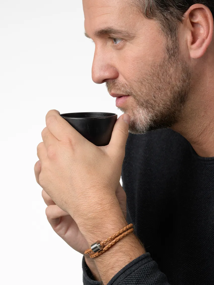Heren as armband/assieraad gevlochten leer cognac & RVS ashouder