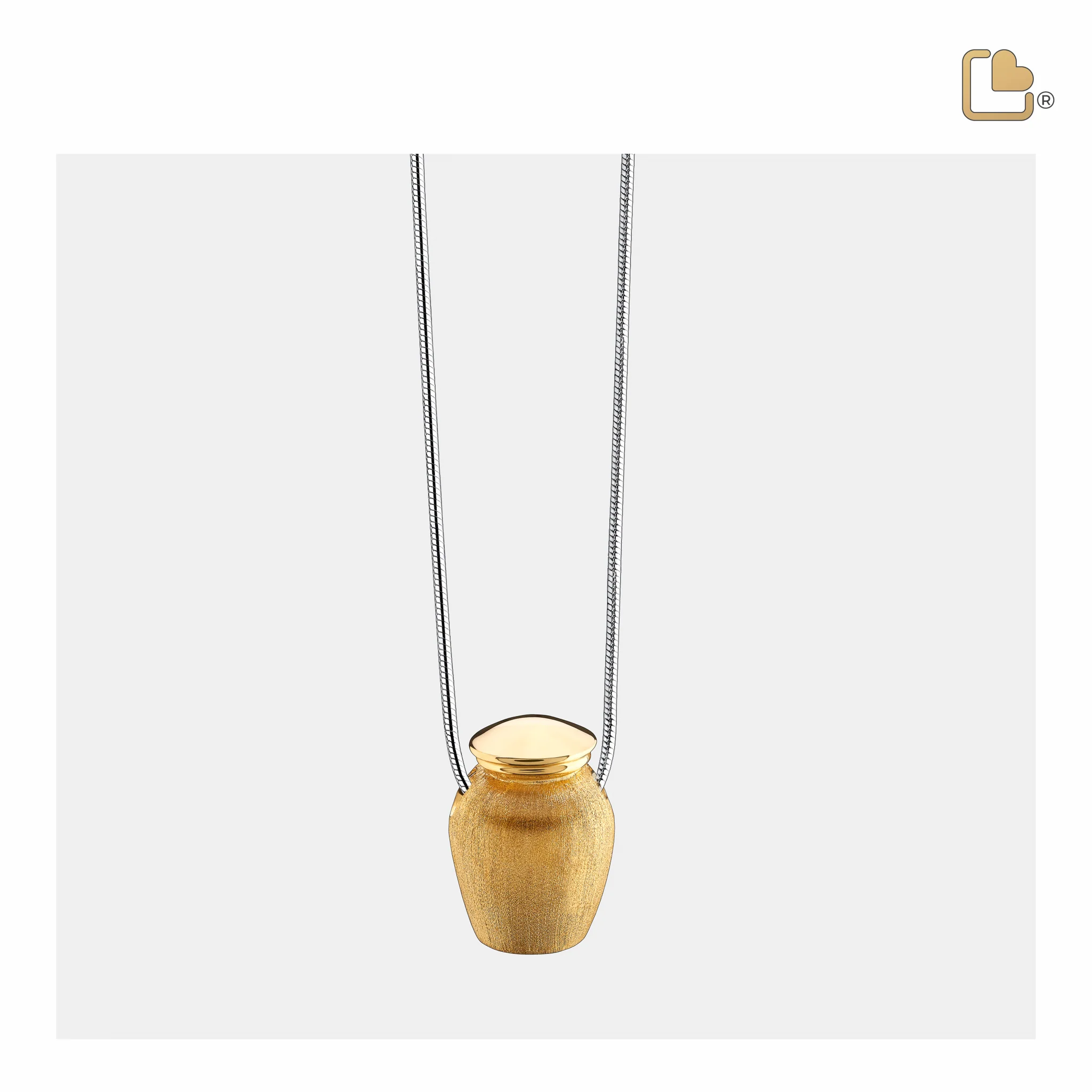 Handgemaakte ashanger vervaardigd uit goud verguld 925 Sterling zilver uit de exclusieve LoveUrns Treasure collectie. Met fraaie glimmend en gematteerd gouden en zilveren afwerking. Slijtvast gerhodineerd zilver. Hierdoor is dit assieraad sterker, oxideert het niet, is het niet gevoelig voor atmosferische invloeden en behoudt het langer zijn glans en elegantie. Met holle ruimte voor een symbolische hoeveelheid as of haar. Vulbaar en eenvoudig afsluitbaar met een inbusschroefje aan de achterzijde.Deze ashanger wordt geleverd met het bijpassende, originele zilveren LoveUrns Treasure collier van 50 centimeter (voorzien van een extra stevig karabijnslot).Inclusief echtheidscertificaat, vulsetje en elegante LoveUrns Treasure Box™.