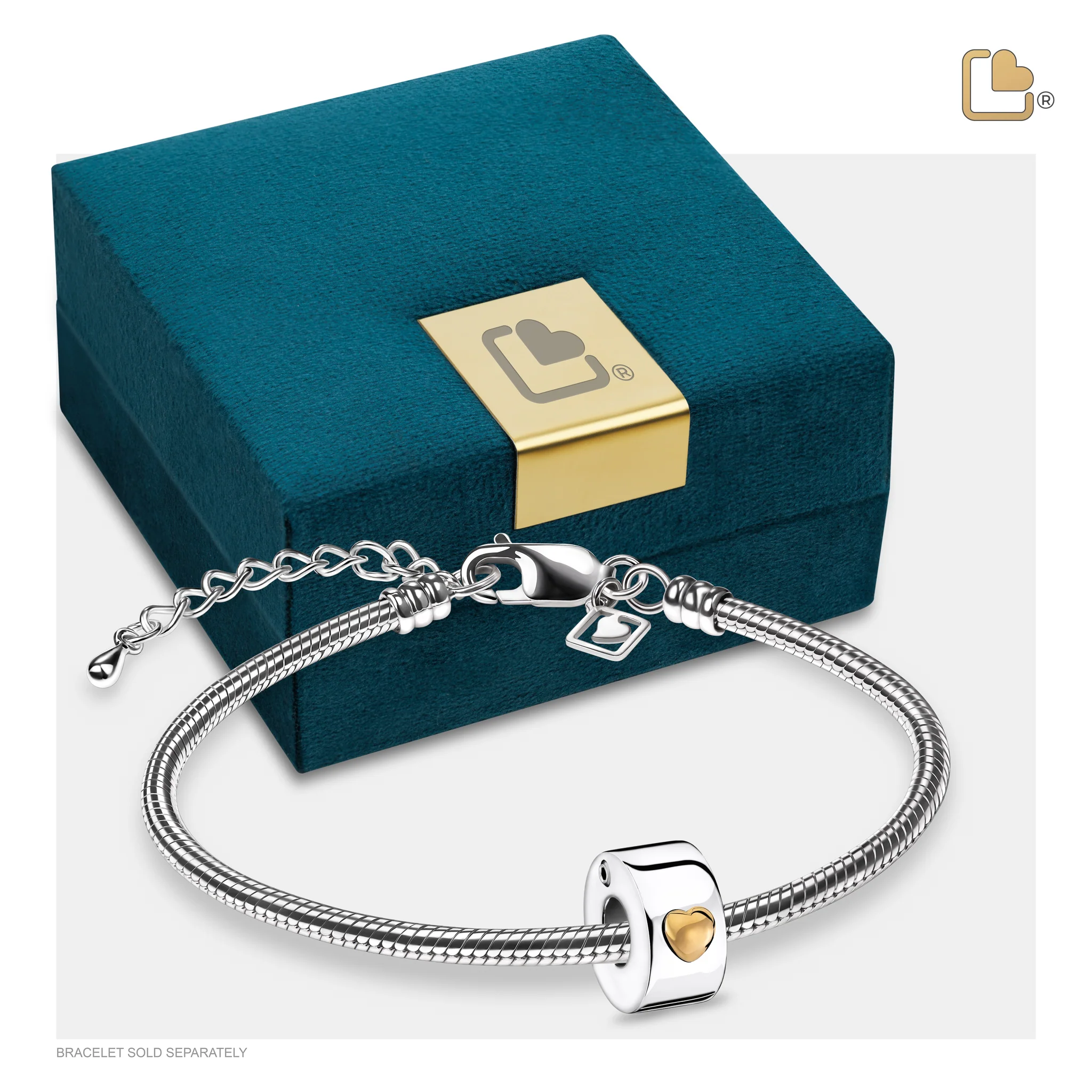 Handgemaakte asbedel vervaardigd uit 925 Sterling zilver uit de exclusieve LoveUrns Treasure collectie. Met fraaie glimmend zilveren afwerking met goud verguld hartje. Slijtvast gerhodineerd zilver. Hierdoor is dit assieraad sterker, oxideert het niet, is het niet gevoelig voor atmosferische invloeden en behoudt het langer zijn glans en elegantie.Met holle ruimte voor een symbolische hoeveelheid as of haar. Vulbaar en eenvoudig afsluitbaar met een inbusschroefje aan de achterzijde.Deze asbedel past perfect op de zeer fraaie bedelarmband van LoveUrns (deze is los bij te bestellen) of aan het LoveUrns assieraad collier. De asbedel past ook op bedelarmbanden en colliers van o.a. Pandora, SimStars en Trollbeads.Deze asbedel wordt geleverd exclusief armband en inclusief echtheidscertificaat, vulsetje en LoveUrns Treasure geschenkverpakking.