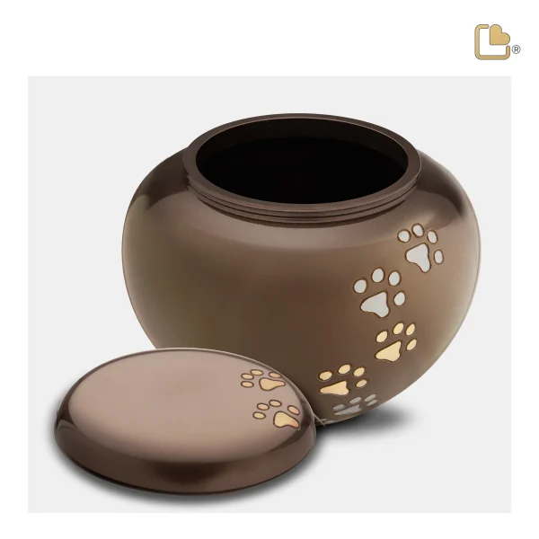 Met handgegraveerde gouden en zilveren pootafdrukken die langs de zijkant van de urn omhoog lopen en zelfs op het deksel verschijnen, vormt deze urn een eerbetoon aan de speelse aard van uw dierbare huisdier.