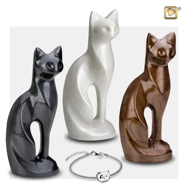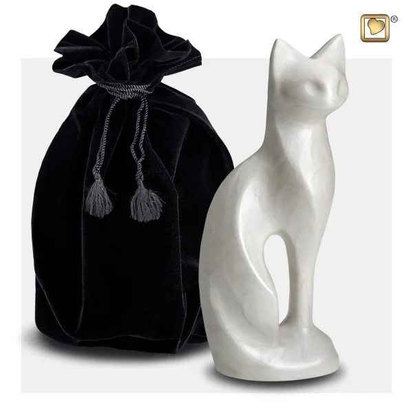 De sierlijke handgemaakte kattenfiguur-urnen zijn prachtig met de hand gemaakt en hebben een parelmoerachtige afwerking in brons, wit en middernacht. Ze hebben een schroefdraadopening aan de onderkant en zijn beschermd met GlossCoat™-technologie. Capaciteit: 0,3 liter.