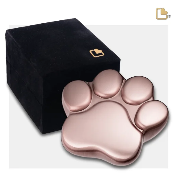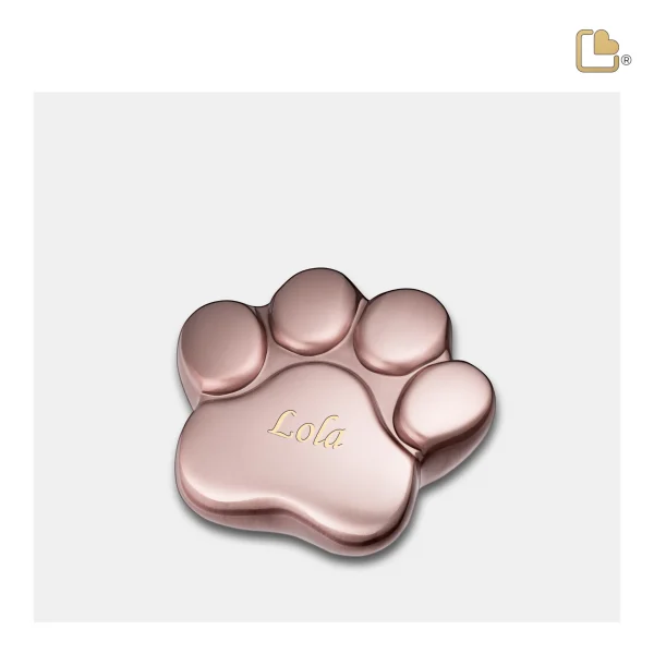 De LovePaw™ pootafdruk huisdier mini-urn in geborsteld roségoud is een elegant ontworpen messing urn voor uw geliefde huisdier.