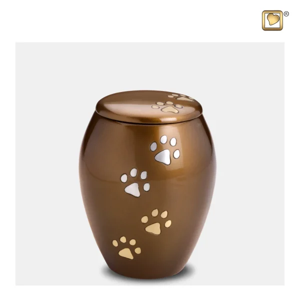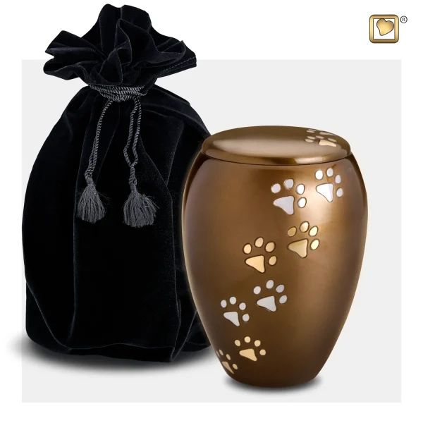 Deze eigentijdse, maar klassieke urn is handgemaakt en met de hand beschilderd, speciaal ontworpen als een extra grote urn voor de as van uw huisdier. De stilistische pootafdrukken herinneren u aan hun wandeling door uw hart. Het stijlvolle ontwerp fungeert zowel als een comfortabele laatste rustplaats voor uw geliefde huisdier als een prachtige vaas om in uw huis neer te zetten. Personaliseer het met een (optioneel) bericht en de naam van uw huisdier voor een extra bijzondere herinnering.