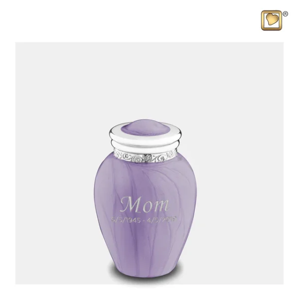 De buitenzijde van de urn heeft een glanzende afwerking met een parelachtig effect, met fijne texturen die met de hand zijn aangebracht. De zilveren afwerkingen op het bovenste deksel van de urn complementeren de tinten perfect.