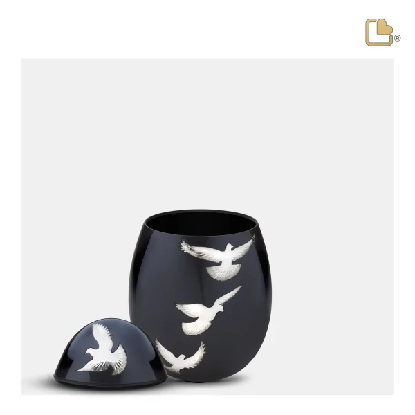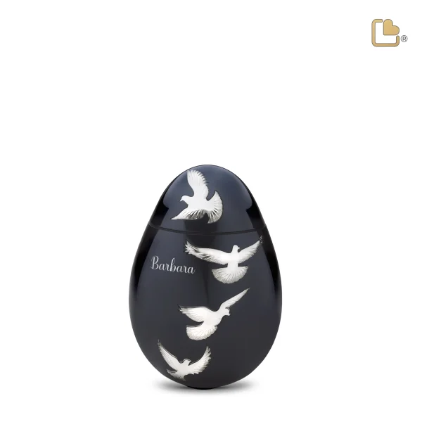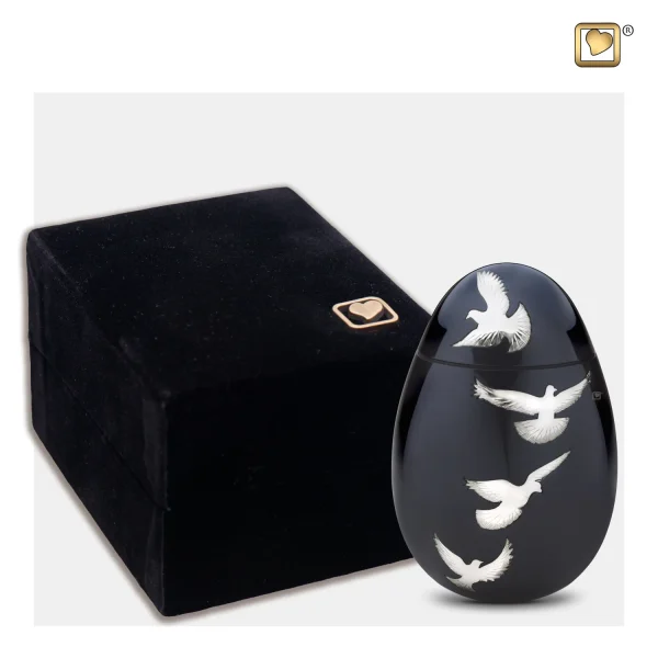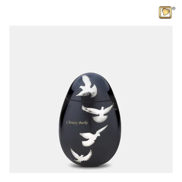 Het levendige contrast tussen de zilveren vogels en de midnight glans is opvallend qua uiterlijk, maar biedt tegelijkertijd een rustgevend en geruststellend gevoel. De ovale vorm van de mini-urn maakt het tot een bijzonder uniek ontwerp.