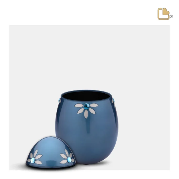Op de urn zijn sierlijk geëtste, gedetailleerde bloemblaadjes te zien. Met een schitterend echt Swarovski-kristal in blauwe tinten dat hen omringt. Het geheel is prachtig vormgegeven en biedt een mooie manier om de as van een dierbare voor altijd te herdenken.