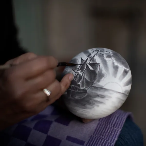 De plateelschilders schilderen met de hand de traditionele Royal Delft decoraties op de Pebble. Zij doen dit met speciale penselen van marter- en eekhoornhaar en een op kobaltoxide gebaseerde zwarte verf. De kobalt in de verf ondergaat in de oven een chemische reactie waardoor de kleur verandert van zwart naar blauw. Vervolgens gaat de Pebble nog een keer de oven in.