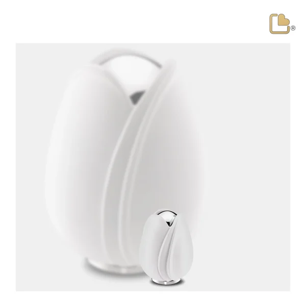 De Tulip™ collectie van LoveUrns is geïnspireerd op de vroege lentebloesems die hoop en wedergeboorte symboliseren. Onze tulp mini-urn in wit en gepolijst zilver belichaamt op prachtige wijze dezelfde essentie als deze levendige bloemen.