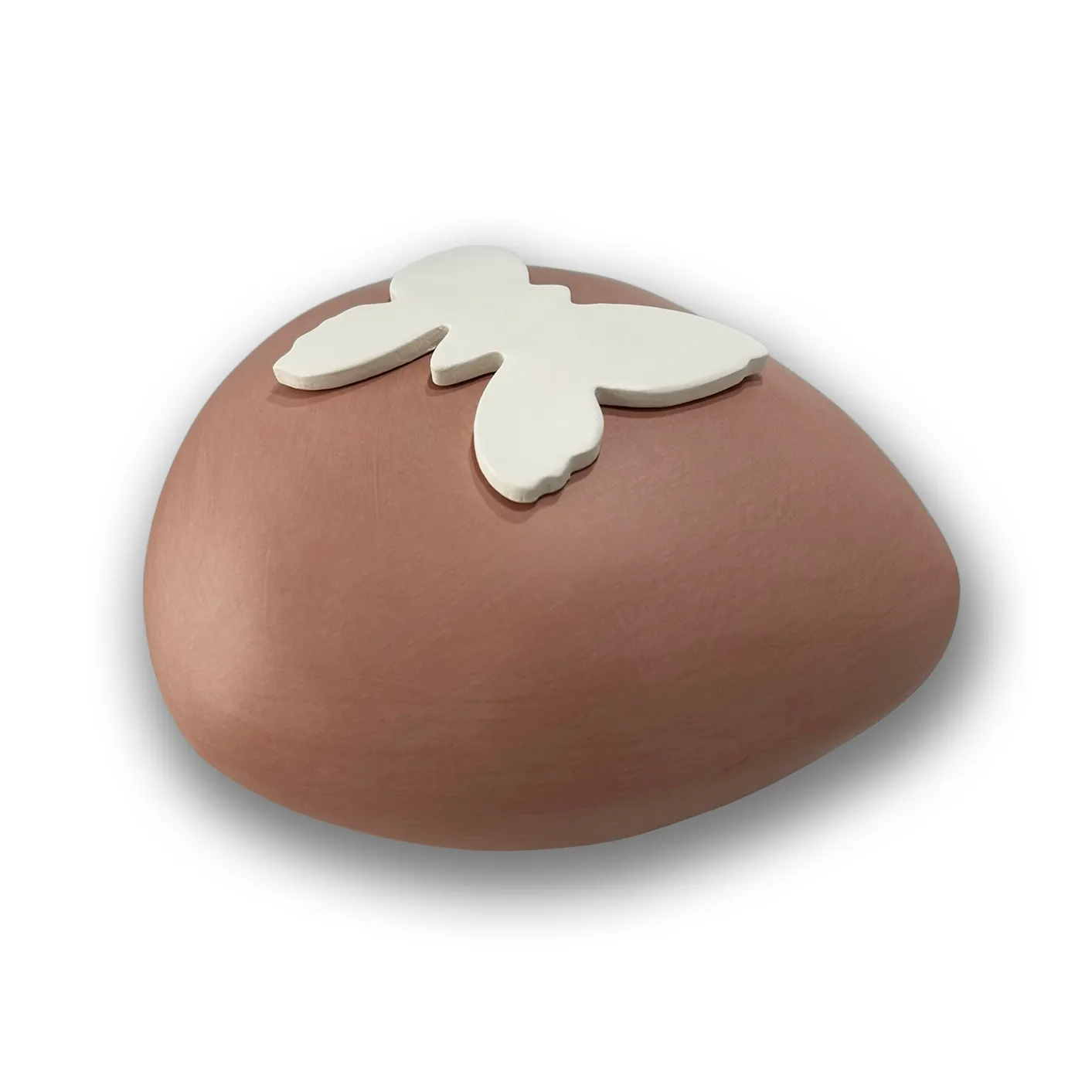 Eterna x Unieke Urn exclusieve met de hand vervaardigde keramische kinderurn in zacht roze met een witte vlinder. De samenstelling van deze urn is in samenwerking met Eterna ontworpen en exclusief verkrijgbaar bij Unieke Urn.