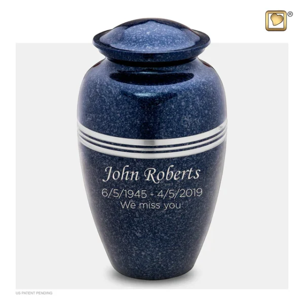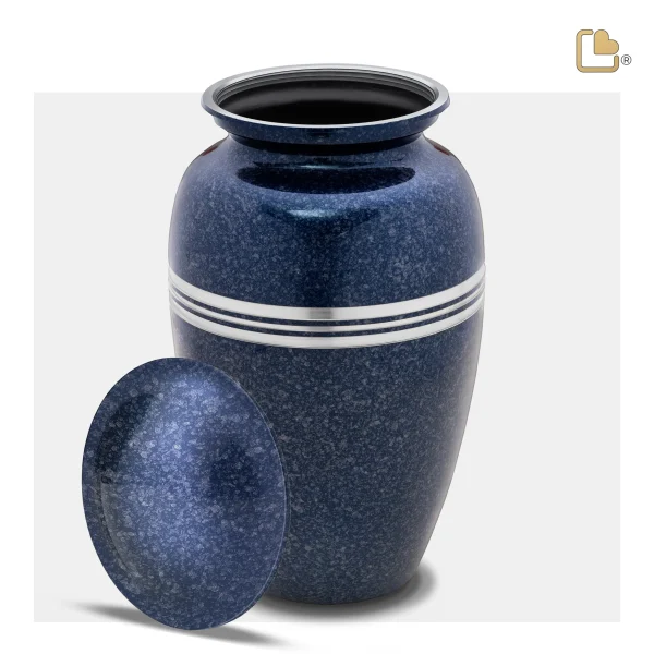 Drie zilveren accentbanden van verschillende grootte sieren het bovenste deel van de urn en bieden een helder contrast met de diepe blauwe tinten. Deze urn leent zich uitstekend voor een (optionele) persoonlijke gravure, waardoor het een nog persoonlijker eerbetoon wordt. Het is een majestueuze en elegante urn om een geliefde mee te gedenken.
