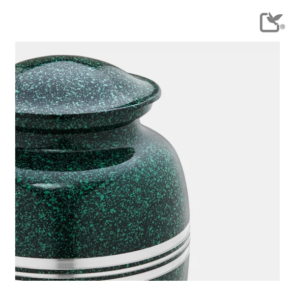De urn is voorzien van een gespikkelde afwerking die donkere en lichtere tinten combineert, waardoor diepte aan het oppervlak wordt toegevoegd. Daarnaast heeft het een eenvoudig drievoudig bandontwerp met drie heldere, gladde banden die de randen van de urn omlijsten.